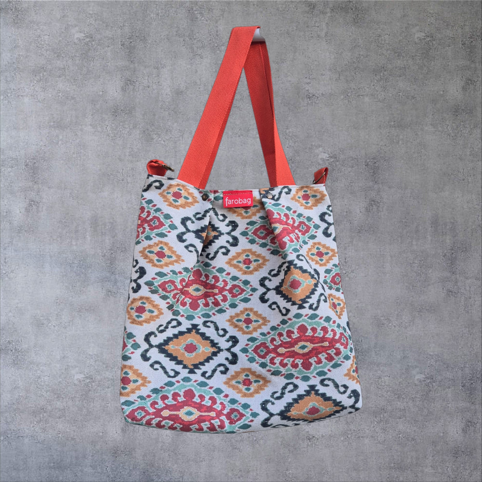 Un estampado geométrico de inspiración étnica que combina motivos romboidales y formas ornamentales en tonos teja, coral, verde y azul profundo sobre una base clara. El dibujo recuerda a tejidos tradicionales reinterpretados con una paleta moderna y equilibrada, llena de ritmo y personalidad. Es un diseño expresivo y cálido, pensado para aportar carácter y un aire viajero al día a día.