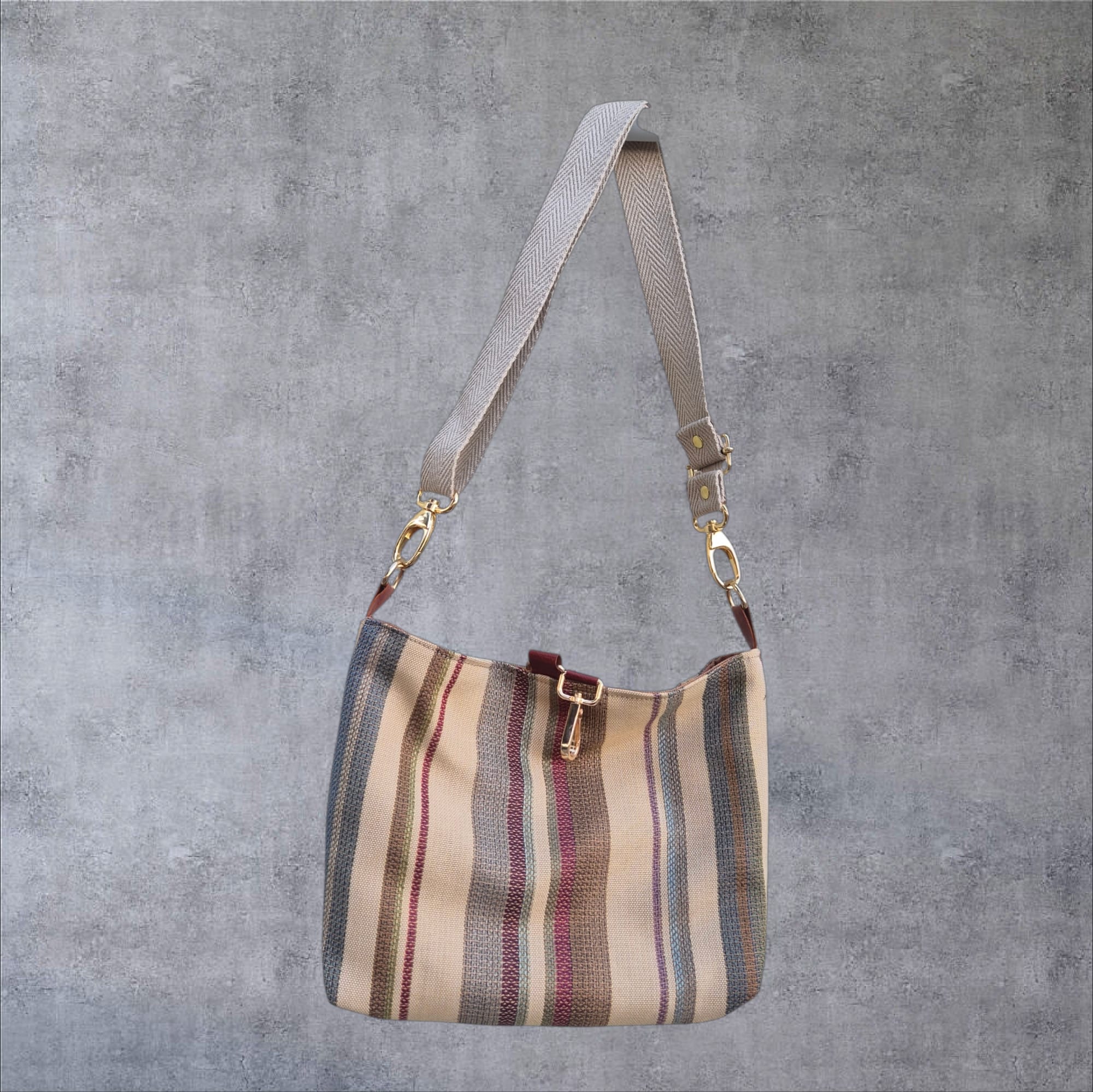Un estampado de rayas finas verticales en blanco roto sobre fondo arena, inspirado en tejidos clásicos de verano y en la ligereza del lino natural. Las líneas estilizan la silueta del bolso y aportan un ritmo visual suave y elegante, transmitiendo frescura y equilibrio. Es un diseño limpio y atemporal, pensado para quienes buscan naturalidad, luz y sofisticación sin esfuerzo.