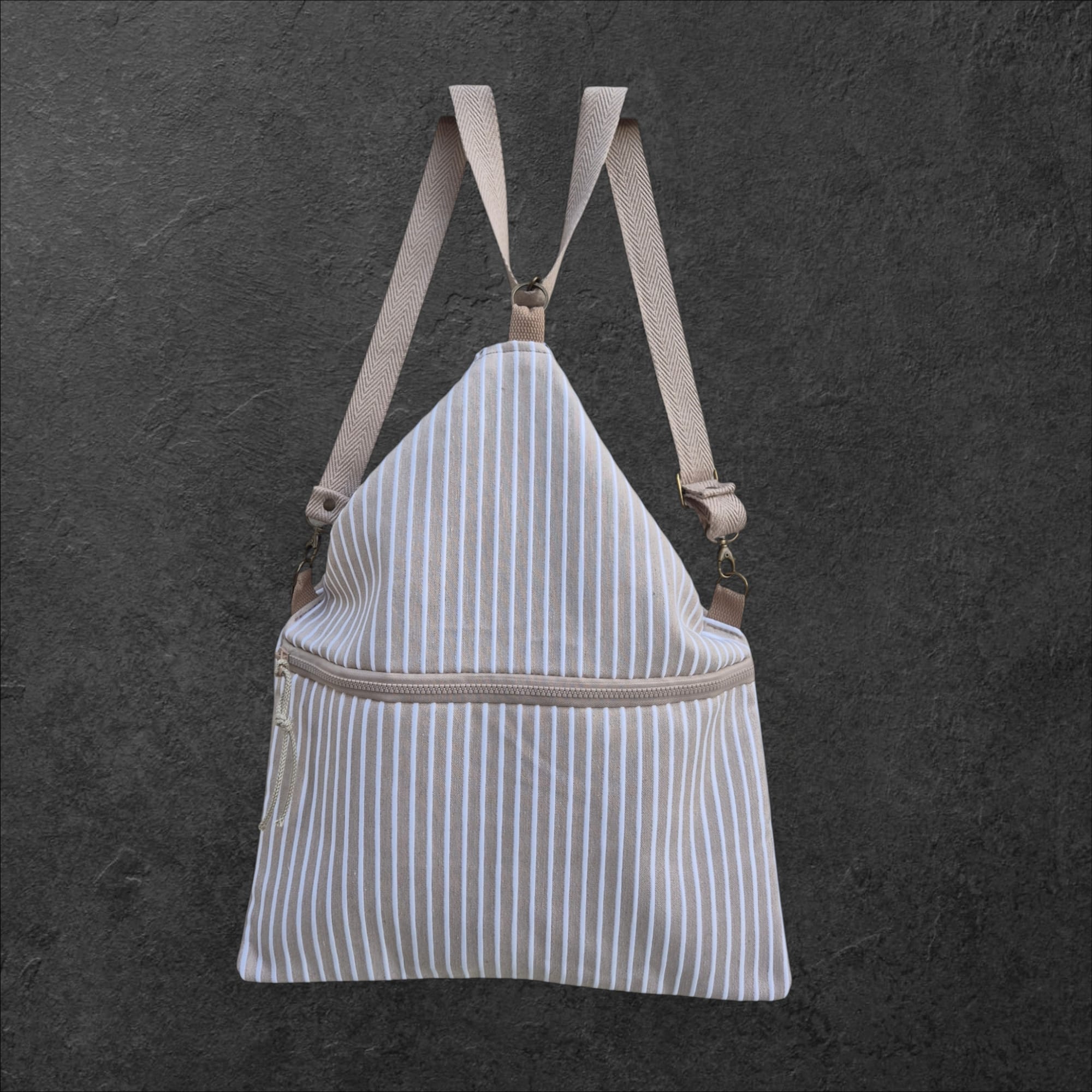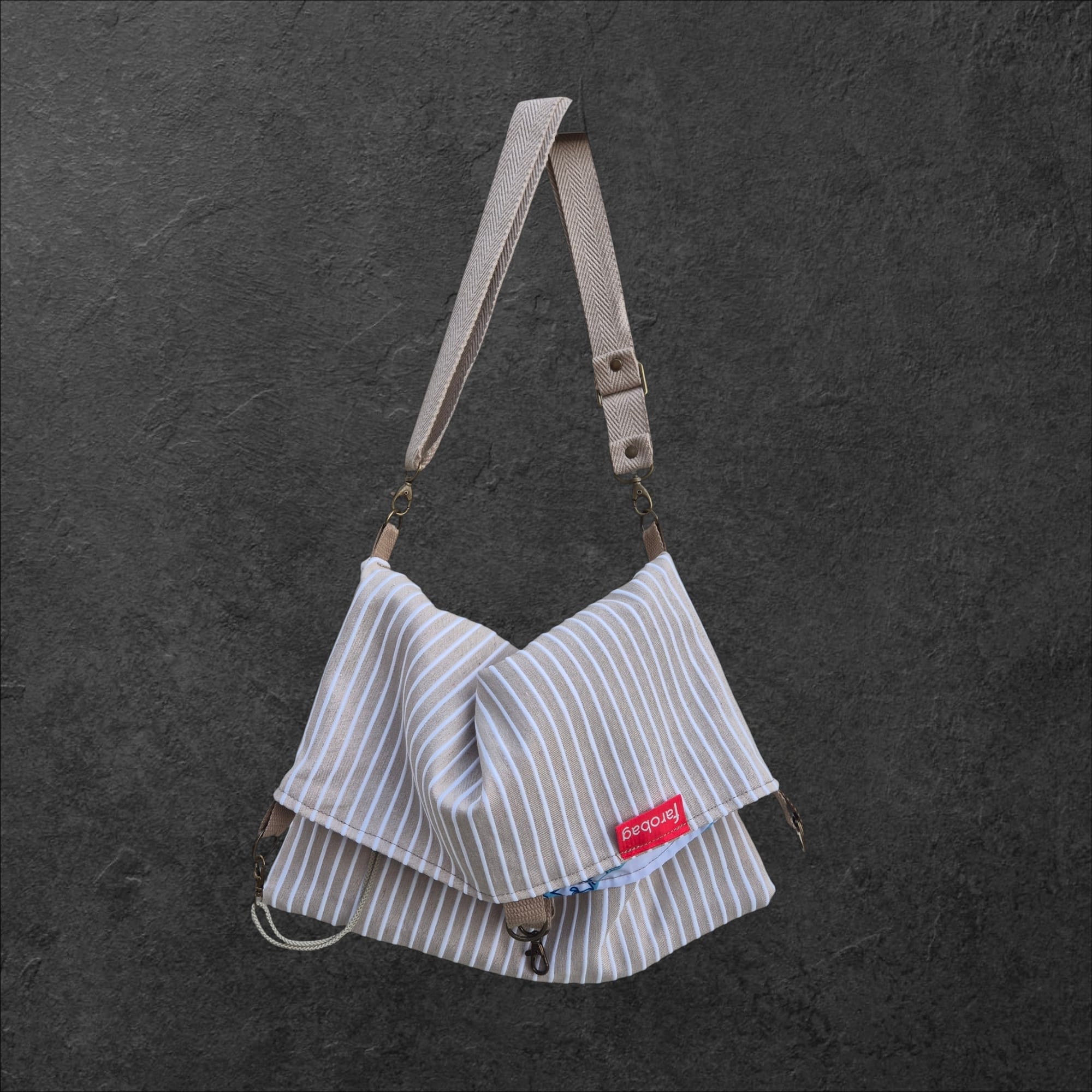 Un estampado de rayas finas verticales en blanco roto sobre fondo arena, inspirado en tejidos clásicos de verano y en la ligereza del lino natural. Las líneas estilizan la silueta del bolso y aportan un ritmo visual suave y elegante, transmitiendo frescura y equilibrio. Es un diseño limpio y atemporal, pensado para quienes buscan naturalidad, luz y sofisticación sin esfuerzo.