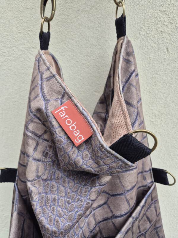 Tela exterior imitando piel de cocodrilo en un color verdoso, el interior de color caldera mezclado con beige