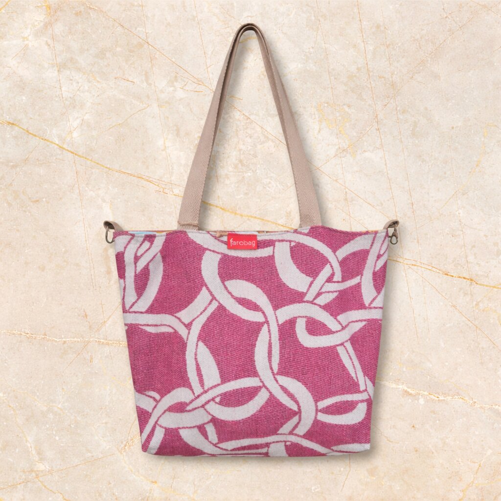 Un estampado gráfico de formas entrelazadas en tono rosa frambuesa sobre una base clara, que crea un juego visual fluido y contemporáneo. Las líneas curvas aportan movimiento y continuidad, evocando conexiones orgánicas y dinamismo sin resultar recargado. Es un diseño actual y expresivo, pensado para aportar personalidad y un toque creativo al día a día.
