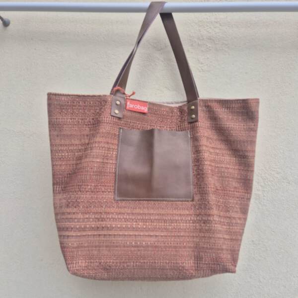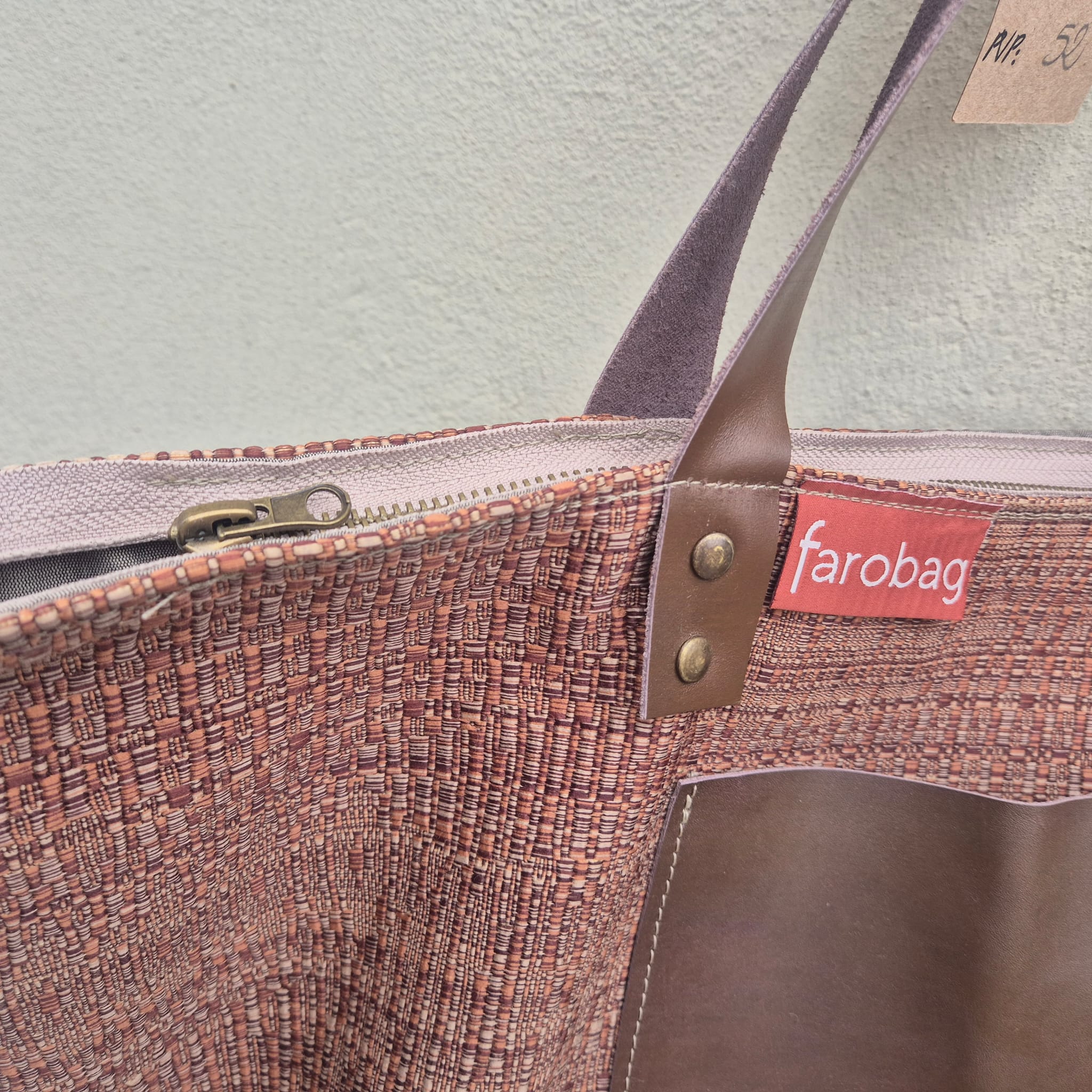 Bolso espacioso y resistente, confeccionado en tela de tapicería en tonos teja, beige y marrón. Sus asas de cuero aportan elegancia y durabilidad, mientras que el cierre con cremallera asegura mayor seguridad. Un diseño sofisticado y funcional, perfecto para viajar con estilo y sostenibilidad. ♻️🌿